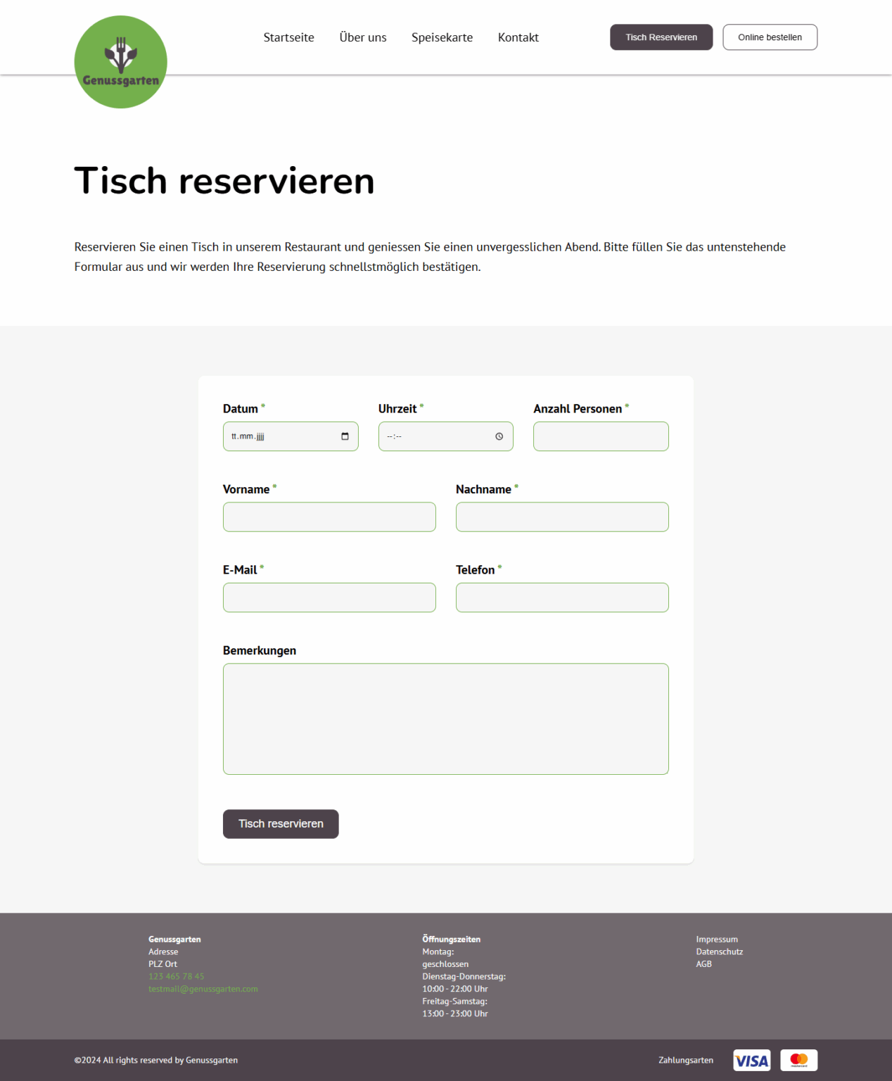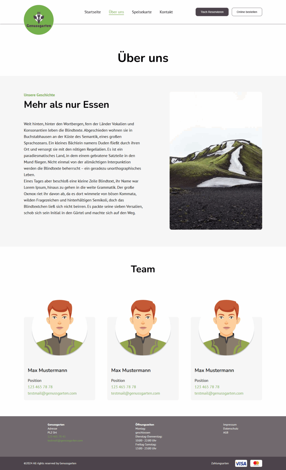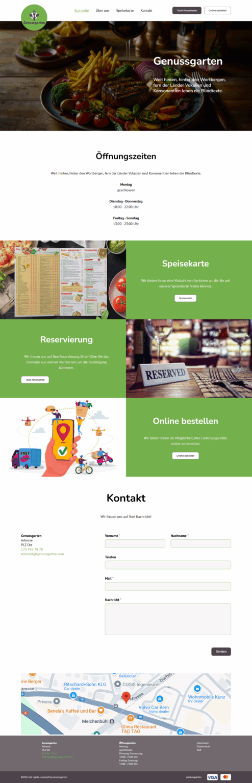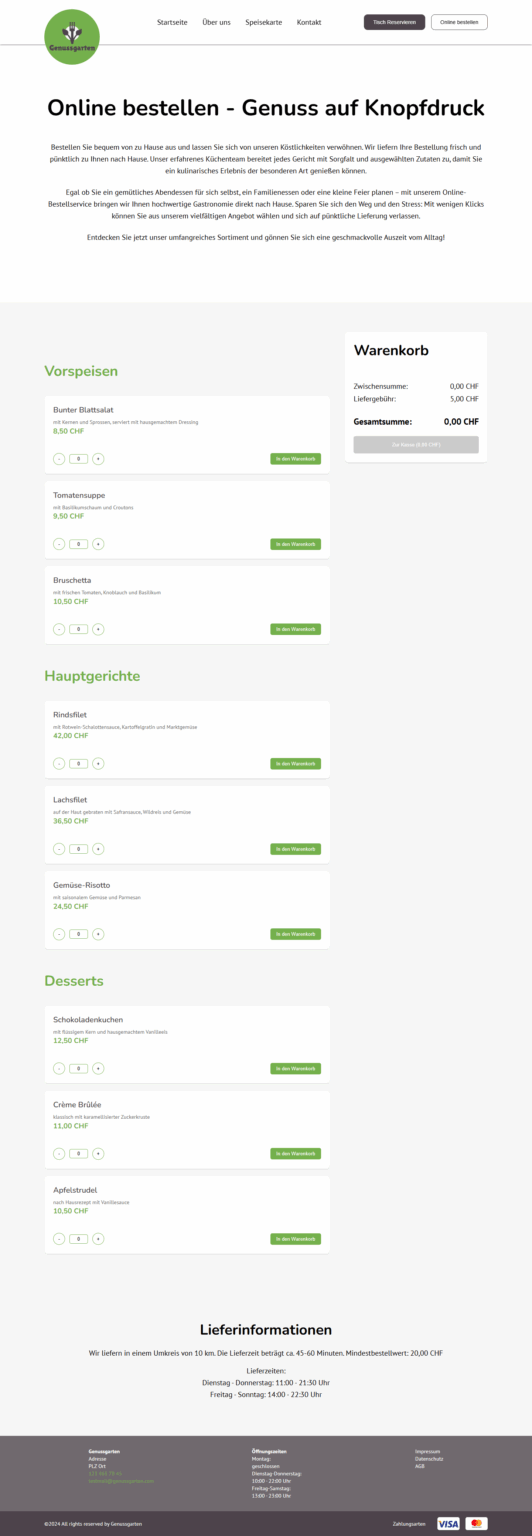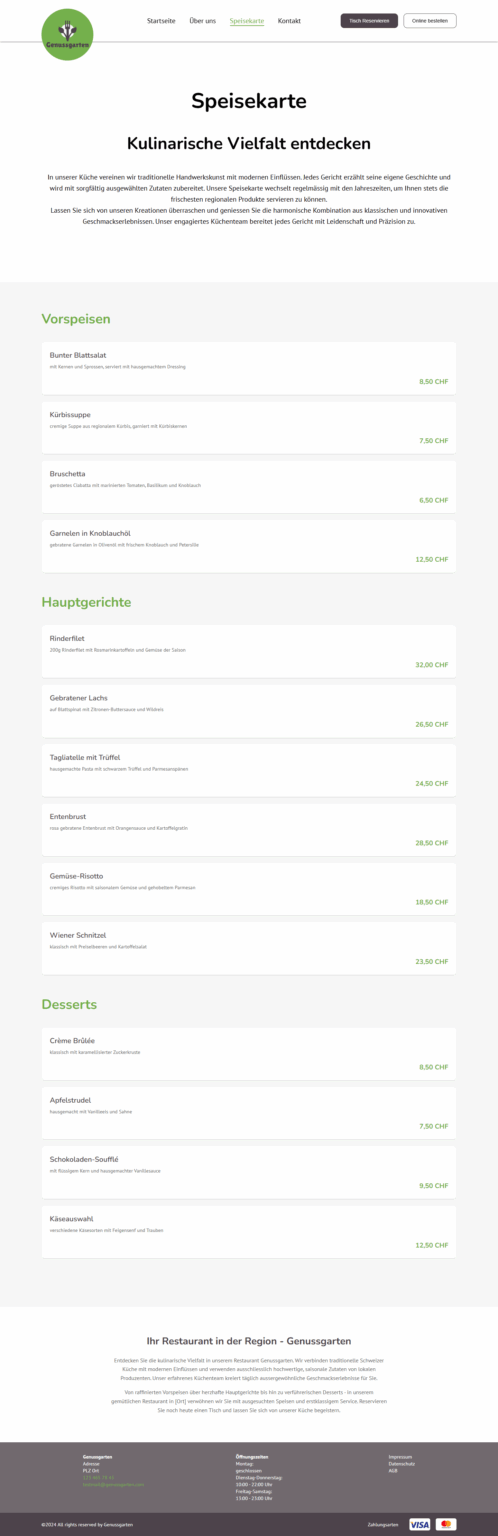 Das Projekt „Genussgarten Webdesign“ wurde im Rahmen eines Kurses an der Onlineschule erstellt. Ziel war es, eine ansprechende und benutzerfreundliche Webseite für das fiktive Restaurant „Genussgarten“ zu entwickeln. Der Fokus des Designs liegt auf einer modernen und einladenden Gestaltung, die die Philosophie des Restaurants – Genuss und Natur – widerspiegelt. Die Farbpalette orientiert sich an natürlichen Tönen wie Grün, Braun und Creme, um eine warme Atmosphäre zu schaffen. Klare Strukturen und intuitive Navigation sorgen für eine optimale Benutzererfahrung. Die Webseite umfasst unter anderem folgende Bereiche: Startseite mit Restaurantvorstellung, Speisekarte, Reservierungsfunktion sowie Online Bestellung.